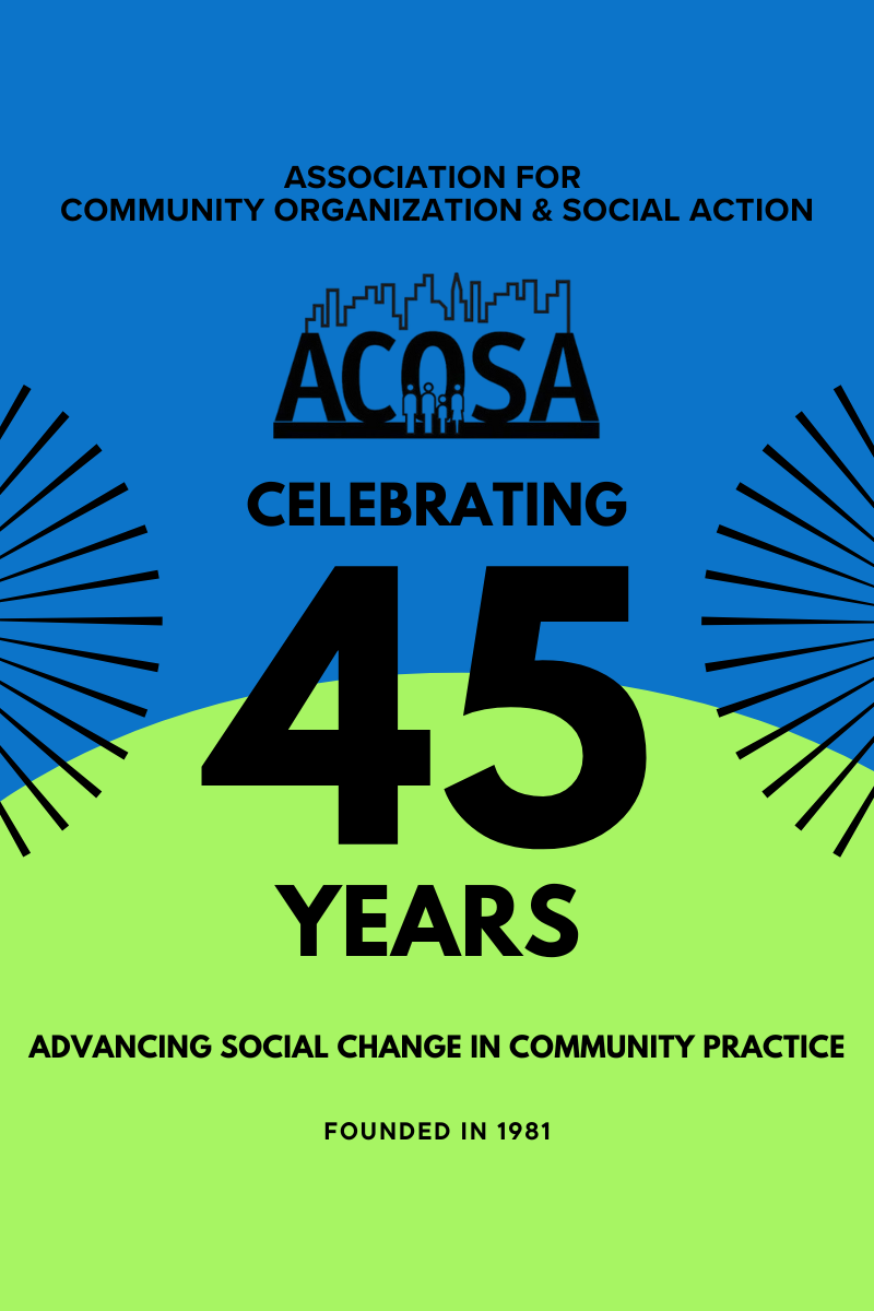 This year, ACOSA, the Association for Community Organization and Social Action, proudly celebrates 45 years of advancing justice through community, scholarship, and action. Together, we have built a professional home for organizers, educators, researchers, and advocates committed to equity and social change.